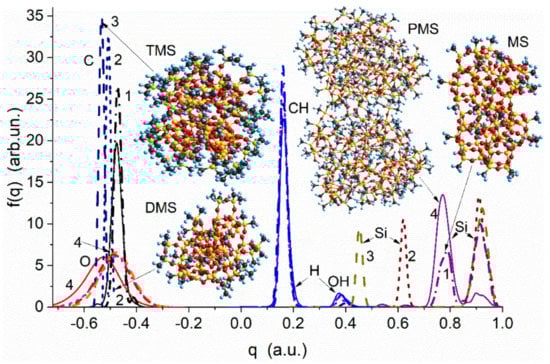 Charge distribution functions of the H, C, O, and Si atoms in nanoparticles of silica with methyl silyl (MS, dot-dashed lines, curves 1), dimethylsilyl (DMS, short-dashed lines, curves 2), and trimethylsilyl (TMS, dashed lines, curves 3) groups and two PMS nanoparticles (solid lines, curves 4) (PM7 [,] method).