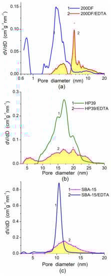 Differential NLDFT PSD of Crosfield silica gels (a) 200DF and (b) HP39, and (c) SBA-15 [,] initial and modified by N-(triethoxysilylpropyl)ethylenediaminetriacetic acid (EDTA) (Gelest, Morrisville, USA).