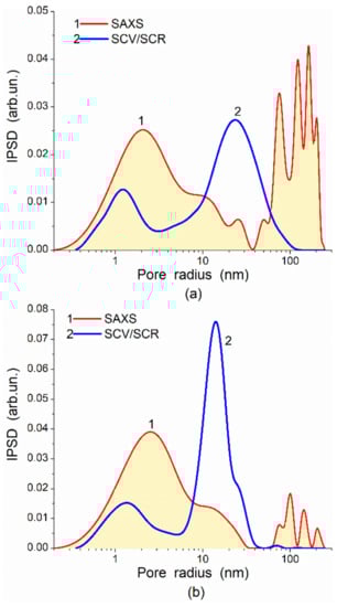 The difference in the SSAXS and SBET values allows one to evaluate a possible increase in the specific surface area due to certain activation, e.g., burn-off activation of carbons (Figure 1) or washing–swelling–freezing–drying of polymers (Table 3 and Table 4, Figure 13 and Figure 14). Additionally, some results of swelling of soft polymeric structures affecting the textural characteristics can be observed using NMR cryoporometry or DSC thermoporometry (e.g., for cryogels or hydrogels). These effects can also appear upon ions’ adsorption, low-molecular-weight compounds from the gaseous (vapor) phase (e.g., water, see Figures S14–S16), or solutes from liquid media. This is because the polymeric adsorbents or related composites can demonstrate a much greater swelling degree in aqueous media than oxide or carbon adsorbents. Thus, to analyze the complex phenomena for composites being in different dispersion media, a maximum large set of methods should be used.
