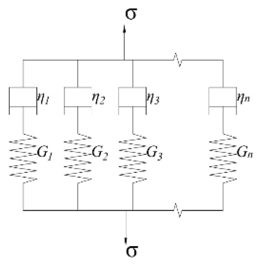 To further quantitatively analyze the effect of test temperature on relaxation characteristics of OGFC, the second-order extensive Maxwell model [34,35,36,37] and the Scott-Blair model [38], shown in Figure 7 and Equations (21) and (22), were employed to fit the relaxation modulus curve: