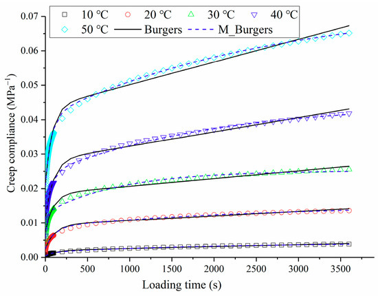 To further quantitatively analyze the influence of temperature on creep characteristics of OGFC, the Burgers model and modified Burgers model, shown in Figure 3 and Equations (17) and (18), were applied to fit the creep compliance curve [30,31,32,33]. The parameters of the two models are fitted by the programming algorithm in Excel software (Microsoft Corporation, Albuquerque, NM, USA) according to Equation (19). The fitting results are given in Table 3.