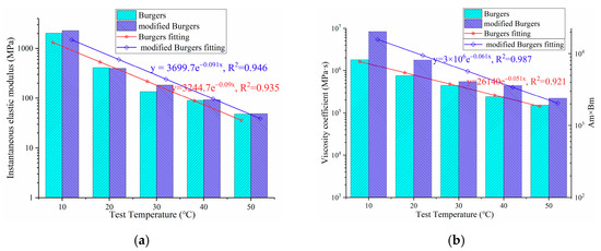 According to Table 3, the variation of the instantaneous elastic modulus and viscosity coefficient of OGFC with test temperature is plotted, as shown in Figure 4. From the fitting results in Figure 4a, it can be seen that with the increase in test temperature, the instantaneous elastic modulus and of OGFC are decreasing, which indicates that the resistance to instantaneous elastic deformation of OGFC decreases with the increase in temperature. Moreover, the exponential function is employed to fit the variation of the instantaneous elastic modulus with temperature. From the fitting results of the exponential function, it can be found that the instantaneous elastic modulus of OGFC decreases as a negative exponential function with the increase in temperature. The rates of decline obtained by the Burgers model and modified Burgers model are very close.