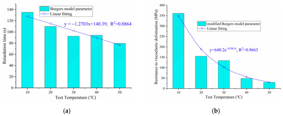 Figure 5 shows the variation of retardation time of the Burgers model and parameters of the modified Burgers model with the test temperature. As shown in Figure 5a, with the increase in test temperature, the retardation time of OGFC presents a decreasing trend, which indicates that the growth rate of viscoelastic deformation is accelerated after the temperature increases, and accelerates the viscoelastic deformation of OGFC. As shown in Figure 5b, the parameter of anti-viscoelastic deformation shows a negative exponential decreasing trend with the increase in test temperature, which implies that the anti-viscoelastic deformation ability of OGFC decreases rapidly with the increase in test temperature.
