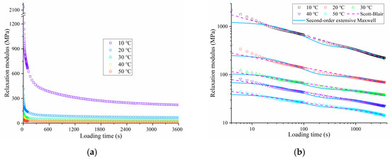 According to the relationship between the creep compliance and relaxation modulus of asphalt mixture in Equation (6), the relaxation modulus of OGFC at 10 °C, 20 °C, 30 °C, 40 °C, and 50 °C is calculated by using MATLAB software (MathWorks.Inc, Natick, MA, USA), as shown in Figure 6. It can be observed from Figure 6a that with the increase in loading time, the relaxation modulus of OGFC first decreases rapidly and then decreases slowly.