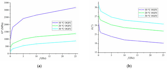 From Figure 8b, it can be found that with the increase in loading frequency, the phase angle of OGFC decreases, at first rapidly and then slowly. Moreover, the phase angle of OGFC increases with the increase in test temperature. At higher temperature or lower loading frequency, the OGFC has a larger phase angle, indicating that it has higher viscosity.