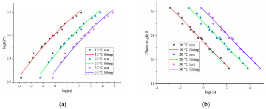 In order to further analyze the variation of the dynamic modulus and phase angle of OGFC with the loading frequency and the influence of test temperature on the dynamic modulus and phase angle of OGFC, the modified Sigmoid model, as shown in Equations (23) and (24), is employed to fit the master curve of dynamic modulus and phase angle of OGFC [39,40]. The fitting results are shown in Figure 9 and Table 5.
