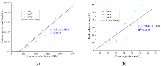 Figure 10 shows the comparison of the dynamic modulus and phase angle of OGFC obtained under the static and dynamic loads. As can be seen from Figure 10a, there is a great difference between the dynamic modulus obtained from the test and that derived from creep compliance, but there is a good linear correlation between them. Figure 10b shows that the phase angle obtained by the experiment and the derivation are scattered in the figure, which shows that the correlation between them is poor.