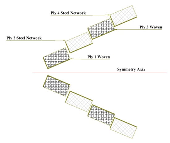 Various complex manufacturing methods were used to make laminated composite structures. Accordingly, the hand-layup method, which is considered the cheapest and simplest, was proposed and selected [24,25]. The manufacturing technique in this method is carried out by procedures where two-sided glass plates are used. One plate is placed as a base and coated by a release agent as wax to avoid sticking. Then after that, a single layer from epoxy material (mechanical properties are listed in Table 1 [26,27]) is uniformly spread over the entire base plate. A glass fiber was placed on the epoxy layer to constitute another layer, followed by repeating the previous step until all the laminate layers were built and completed according to the building sequence as shown in Figure 1. Each laminate contains eight woven glass fiber layers (S1) and a combination of eight layers stuck together four layers from woven glass fibers and four from steel network mats (S2), as shown in Figure 1. The ignition removal technique has been used according to ASTM D3171-99 standard [28]. The mean values were tabulated in Table 2 [4]. The fabricated plates’ thicknesses were average 3.28 mm and 3.08 mm for specimens S1 and S2, respectively.