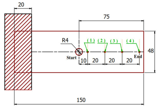 The LAN XI hardware module captured the vibration data connected to the accelerometer (Bruel & Kjaer, Nærum, Denmark) and the impact hammer through BNC cables and connectors (Bruel & Kjaer, Nærum, Denmark). The hardware unit was connected to a laptop, which had a PULSE LabShop V13.5.0 with a LAN cable (see Figure 2). Each un-notched sample has 20 nodes, whereas open hole samples have 4 nodes, equal distances of 30 mm between them. The mobile shock hammer test technique for each sample was developed to identify the response in all nodes, one at a time, using the program software. The hammer acts as the input exciting for the system by giving hammer impacts at each location for the test specimen. In contrast, system’s response at each node was measured by using the accelerometer. Accordingly, vibration parameters, such as natural frequencies and damping ratios, were obtained by extracting information from the FRF curve at each node in various ways obtained using the program software. Quadratic selection technology is used to determine several positioning shapes. The damping ratios and natural frequencies are assigned at positions 1, 2, 3, and 4. The frequency is obtained for two possible modes [25,29,30,31,32,33,34,35,36].