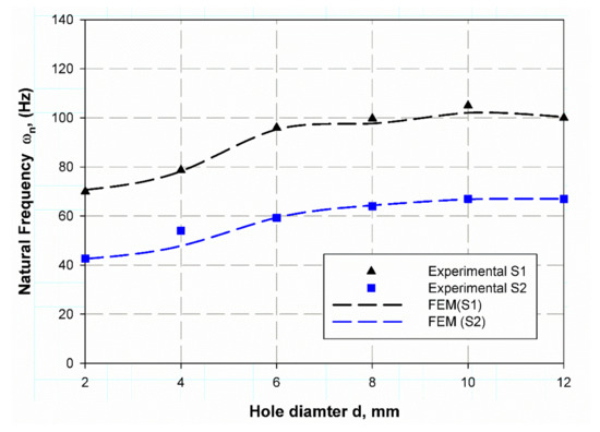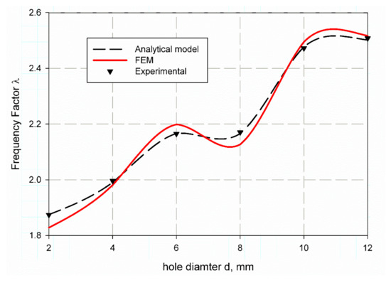 where d is hole diameter, a specimen width that specimen width which specimen width changes according to the hole diameter with 1/6 ratio. The non-dimensional frequency factor () is selected by Reference [39] for specimens that have a hole diameter of 4, 6, and 8 mm that are selected from Reference [43]. Similarly, for those with hole diameters 10 and 12 mm, they are chosen using Reference [44].