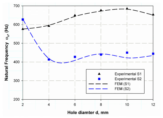 Six samples with a diameter of 2, 4, 6, 8, 10 and 12 mm were used to test the vibration modal analysis response’s size effect. Still, all these samples confirm that the diameter-to-hole width ratio is constant (d/w = 1/6) [7]. The holed specimens have varying thicknesses; therefore, it is listed in Table 3 for specimens S1 and S2. The mechanical properties of S1 and S2 samples are taken from reference [1].