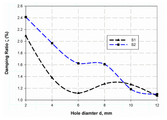 The investigation of experimental modal aims to determine the dynamic behavior, such as natural frequency, damping ratio, and mode shapes of the system configuration during the testing process. Natural frequencies and shapes with which the structure will magnify a load influence can be detected by modal analysis [48]. The first step is to identify the normal frequencies and damping ratios through these analyses, which is carried out by getting information from the frequency response function (FRF) curve. PULSE LabShop automatically supplies the necessary information for both natural frequencies and damping ratios after using different curve fitting. Natural frequency and damping ratios were measured using a modal analysis of the cantilever plate of the un-notch specimen of S1 and S2 material and they are listed in Table 7. It is observed in Figure 4 and Figure 5 that S2 material has a little higher frequency in the first mode (83.1 Hz) while lower frequency (139.8 Hz) in the second mode. In contrast, the first mode has a lower damping ratio (1.9) and higher one (3.25) for the second modes; this is because specimens with steel mesh S2 is heavier than the specimen with glass fiber only S2 (see Table 6); also the steel mesh between glass fiber layers acts as vibration wave dissipation through the rest of material. It is observed that the two first modes have clear values only. Moreover, the frequencies increase with increasing specimen size (see Figure 4 and Figure 5) for modes 1 and 2, respectively. The opposite trend for damping ratios is observed; increasing hole diameter leads to a decrease of damping ratios (see Figure 6 and Figure 7) for modes 1 and 2, respectively. This trend is due to that specimen size increases its cross-sectional area associated with increasing hole radius. The finite element results are in good agreement with the experimental data because finite element analysis takes the real event of the rectangular plate behaviors. The natural frequencies of open-hole specimen on material S1 are clearly shown for mode 1 and 2 (see Figure 4 and Figure 5). The average of four nodes are (70, 78.75, 95.75, 99.75, 105, and 100 Hz) and (575.75, 592.5, 645.25, 675.75, 684.75 and 653 Hz) for (2, 4, 6, 8, 10, 12 mm), respectively. Frequency values rises while the average damping ratio decreases (see Figure 6) in the broad hole diameter range as (2.09, 1.38, 1.12, 1.28, 1.27, 1.07) for Mode 1. Whereas, for Mode 2 (see Figure 7) these values become (2.63, 1.69, 1.43, 1.59, 1.22). The same trend is found for Specimens of material S2 with holes, but with a lower value of natural frequencies (42.75, 54, 59.25, 63.5, 67, 67) and (627, 413.75, 427.25, 439.5, 449.75, 444.25) for mode 1 and 2, respectively. Moreover, the damping ratios are higher than those of S1 material; (2.41, 1.96, 1.63, 1.61, 1.185, 1.1) and (3.91, 1.91, 1.46, 1.73, 1.44, 1.44) for mode 1 and 2 respectively. These trends generally illustrate the size effect on the specimen while in an opposite way, the trend of this influence in response varies about that in the and static loading. In this status, the size effect increases with the specimen size while static loading is decreasing. These results give a similar trend to that of References [12,49], which give a satisfied impression.