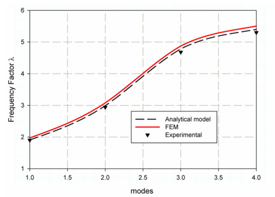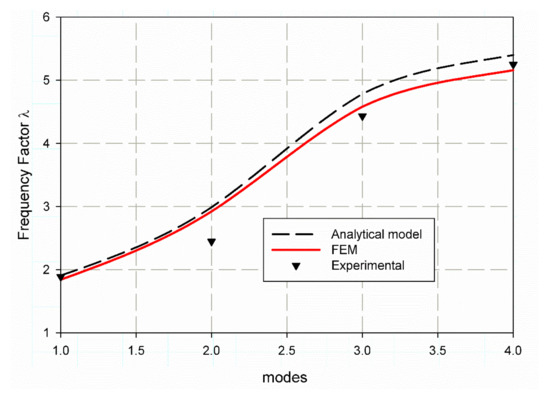 where () is the moment of inertia, () is a non-dimensional frequency factor that can be calculated for different modes using Finite element modeling (FEM), and A is the cross-sectional area after subtraction the area of the circular hole measured as in Equation (11).