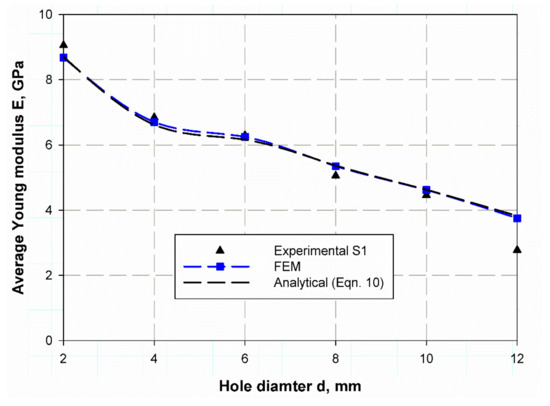 At the first step, the Young’s modulus of the open hole specimen should be measured using Equation (10) based on natural frequency and non-dimensional frequency factor () listed in previous tables. Figure 12 and Figure 13 illustrate the predicted Young modules for both S1and S2 specimens where the prediction is based on an analytical solution of Equation (8) and the FE results are based on the FE prediction of non-dimensional frequency factor (). The obtained results from the analytical, FE, and experimental data are very close but, there are differences among them. This deference increases in S1 with 12 mm hole due to the complicated behaviors of composite laminates. There are also variances in the predicted values as in specimens of hole diameter (2, 4, 6) mm, the error is negative. In contrast, for the sample of (8, 10, 12) mm hole diameter, it is positive. Upon operation, the positive difference is considered a good and more secure than those of negate one. Therefore, this model may be considered as a non-destructive test that can be used to calculate the equivalent Young modulus which is the most important elastic characteristic and mechanical property of any material especially composite laminates.