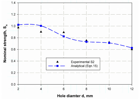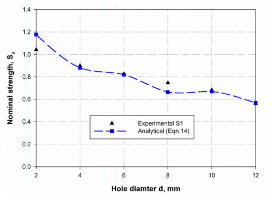 Table 10 listed a comparison between the predicted nominal strength using the present analytical model Equation (14) and experimental ones for S1 and S2. The predicted nominal strength. For S1, it shows very close values to the experimental data with the error percentage (%) of (0.11, 0.72, and 0.11) for un-notch and specimen with (6 mm and 12 mm) open hole diameters, respectively. Whereas these results have a moderate value (2.06, 1.99) for the specimen with 4 mm, and 10 mm holes diameter. Large values (−12.79, 11.14) for the specimen with 2 mm, and 8 mm holes diameter are observed. The same trend for the specimen of material S2 predicted by Equation (15), listed in Table 10, but the error percentages (%) have different values where the close value (0.63) is gone to specimens with 8 mm open holes diameter, the moderate’s values (−5.79, 6.79, 2.96, −4.44) are for specimens with (2, 6, 10 and 12) mm diameters hole, while the large value (−12.79) is for 2 mm diameter hole. However, for safety, the larger values of the error percentage (%) of both materials S1 and S2 is negative, which means it is more secure. The size effect curve is shown in Figure 14 and Figure 15 for material S1 and S2 respectively, it gives a good prediction for the nominal strength with very close accuracy for a specimen which has hole diameters of 2, 4, 10, and 12 mm in S1 material, while it is getting large (Figure 14) in a specimen with 2- and 8-mm hole diameter. Moreover, in the specimen of material S2 all specimens give a quite relative value except those with hole diameters of 4 and 6 mm. The model has the advantage to measure the size effect of the composite specimen using the natural frequency without destroying it, as in LEFM and cohesive zone models based on destructive tests.