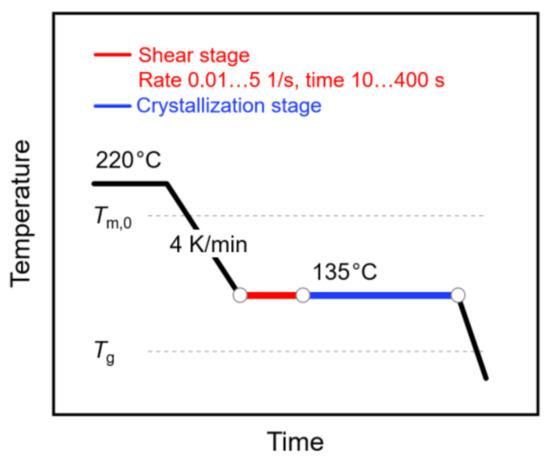 Temperature–time profile for analysis of shear-induced crystallization of poly (L-lactic acid) (PLLA). The relative positions of the equilibrium melting temperature () and of the glass transition temperature () are indicated with the gray dash lines.