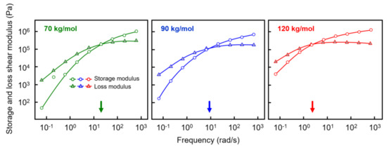 Prior to shear-induced crystallization experiments, the rheological properties of the various samples were investigated in order to obtain information about the reptation relaxation time at the temperature of interest of 135 °C. Figure 2 shows the storage shear modulus G’ (white circles) and loss shear modulus G’’ (gray triangles), both plotted as a function of the frequency of deformation with an amplitude of 0.05%. Most important in the context of estimating relaxation times is the observation of a distinct shift in the crossover frequency, defined as the frequency where G’ and G’’ are equal, to lower values if the molar mass increases (see also the arrows at the frequency axes). For the analyzed polymers with molar masses of 70, 90, and 120 kg/mol, reptation times of 0.05, 0.11, and 0.5 s were obtained as the inverse of the crossover frequency, respectively [45,46,47]. As such, tube relaxation times increased with molar mass, or, in other words, the time for the molecular segments to return into their equilibrium shape after perturbation increased, thus requiring a lower rate of deformation for orientation. Again, while the relation between molar mass and shear-induced nuclei formation has been confirmed in numerous studies on different polymers [34,35,36,37], dedicated work focusing on the PLLA homopolymer is lacking.