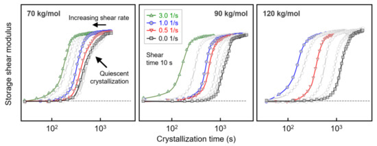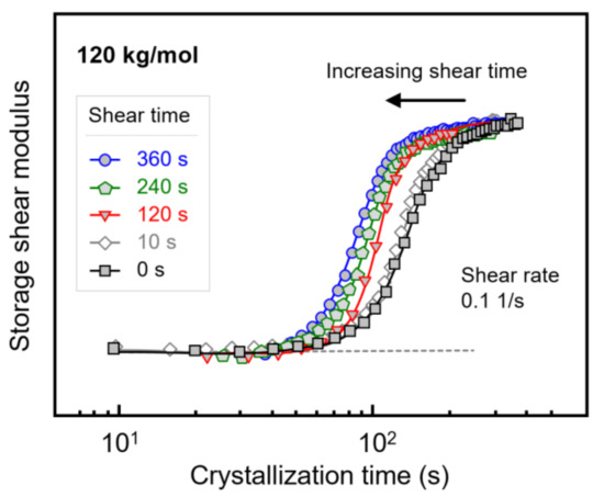 Figure 7 shows the evolution of the storage shear modulus during isothermal crystallization of PLLA with a molar mass of 120 kg/mol, after shearing the melt at a rate of 0.1 1/s for different times between 0 and 360 s. Note that the shear time is included in the crystallization time. Despite the rather low shear rate, shearing for 10 s hardly affected the crystallization rate (see Figure 3 and Figure 4), there is observed a shift in the storage modulus curves to shorter crystallization times with increasing shear time, indicating an increase in the number of point-like nuclei [23,51]. Similar experiments were performed on PLLAs of lower molar mass, yielding qualitatively similar observations. Again, the purpose of variation in the shear time served to evaluate whether shear rate and shear time are interconvertible regarding their effects on crystallization kinetics within the concept of the specific work of flow. For this reason, Figure 4b, showing the crystallization onset time as a function of the specific work of flow for samples subjected to different shear rate only, was expanded to include data observed after shearing for different times.