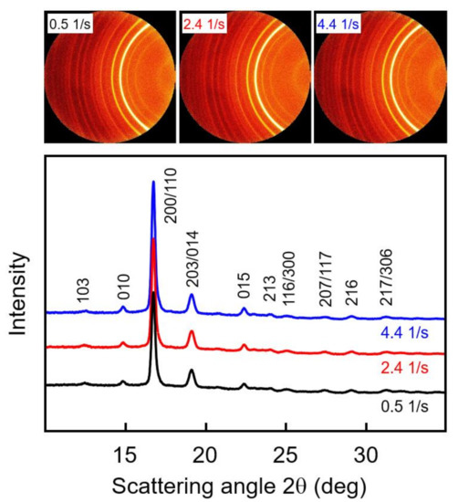 WAXS measurements of samples subjected to shear before crystallization were performed to obtain information about possible crystal orientation and the prevailing crystal polymorph. The top part of Figure 6 shows examples of selected two-dimensional WAXS patterns of PLLA with a molar mass of 70 kg/mol, acquired at different radius positions of 0.4, 1.9, and 3.5 mm of a crystallized disc sheared at 135 °C for 10 s with a rate of 5 1/s, and the bottom graph is a plot of the azimuthally averaged intensity as a function of the scattering angle 2θ. The shear rate is a linear function of the disc radius, and, as such, the WAXS frames are associated with shear rates of 0.5, 2.4, and 4.4 1/s. Note that shearing the melt at 0.5 1/s did not cause shear-induced nucleation, thus representing quiescent-melt crystallization. The frames show sets of Debye-Scherrer rings with a uniform intensity distribution, indicating a random orientation of crystals in the analyzed plane perpendicular to the disc surface. This result agrees with the observation of an increased number of point-like nuclei due to shear and mainly spherulitically grown crystals, even at the outer perimeter of the discs (see bottom left image in Figure 5), and an absence of large amounts of row nuclei or shish-like structures. The radial intensity curves, obtained by azimuthal averaging of the two-dimensional WAXS patterns, shown in the bottom graph, furthermore revealed, by the angular position of the scattering peaks, the exclusive presence of α-crystals. The observed scattering peaks are indexed in Figure 6, based on α-crystal structure information available in the literature [49,50].