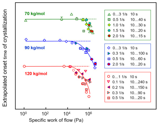Extrapolated onset times of crystallization of PLLA of different molar mass of 70, 90, and 120 kg/mol are shown as a function of the specific work of flow in Figure 8, with the curves vertically shifted relative to each other for improved visibility. The different data sets are based on shear experiments employing different combinations of shear time and rate to obtain a single specific-work-of-flow value (see legends), in order to analyze their interconvertibility for the acceleration of crystal nucleation. The data clearly revealed that within the analyzed range of shear parameters, indeed, it was possible to achieve an interconversion of rate and time to achieve a similar accelerating effect on crystallization.