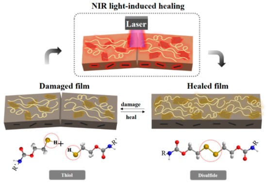 Recently, a system for polymer composite materials that self-heals via the photothermal effect has been proposed [22,23,24,25]. In the self-healing mechanism induced by NIR, fast heat transfer and strong NIR absorption are important, because the heat generated by the NIR light is rapidly transferred to the center to activate self-healing.