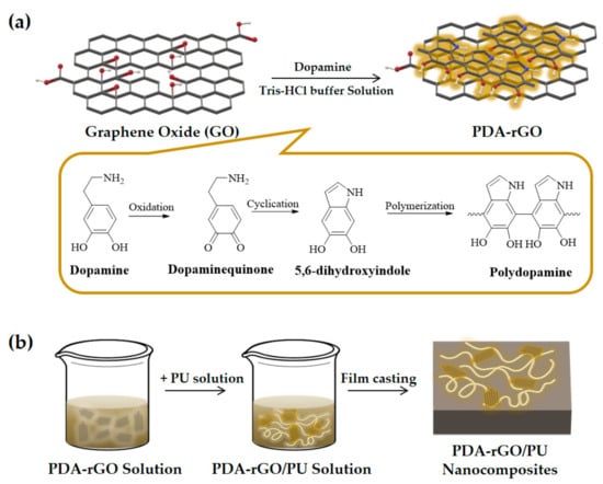 Schematic illustration of (a) the preparation of PDA–rGO, and (b) PDA–rGO/polyurethane (PU) nanocomposites.