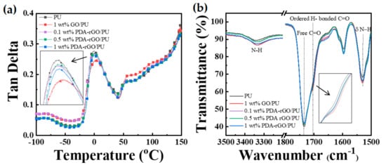 (a) Tan delta curves measured by dynamic mechanical analyzer (DMA) and (b) FTIR spectra of neat PU and its nanocomposites with 1 wt% of GO and 0.1, 0.5 and 1 wt% of PDA–rGO.