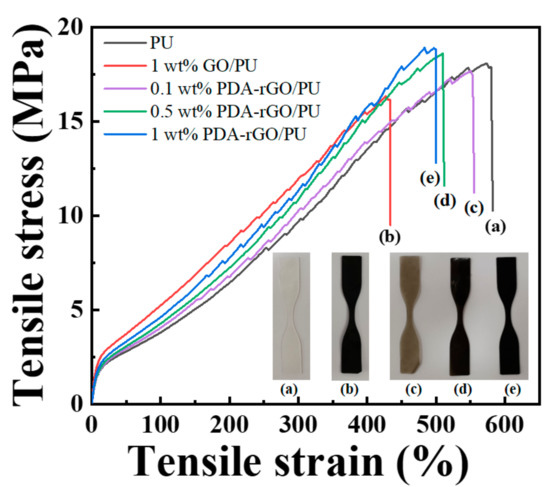 Strain–stress curves of (a) neat PU, (b) 1 wt% GO/PU, (c) 0.1 wt% PDA–rGO/PU, (d) 0.5 wt% PDA–rGO/PU, and (e) 1 wt% PDA–rGO/PU nanocomposites.