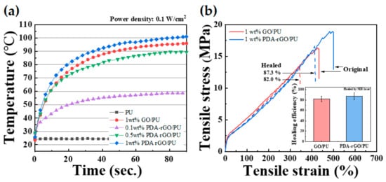 (a) Change in surface temperature during NIR light irradiation at a power density of 0.1 W/cm2 and (b) strain–stress curves for original and healed of 1 wt% GO/PU and 1 wt% PDA–rGO/PU nanocomposites. Self-healing efficiency inserted.