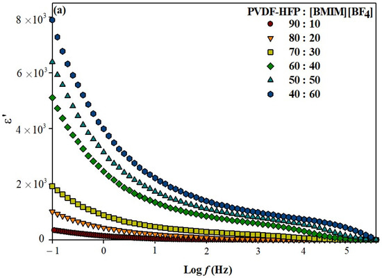 Ionic conductivity is one of the key indicators for high-performance electrolyte in any electrochemical devices. For example, PEMFCs and LIBs applications demand a minimum ionic conductivity of 10−3 S cm−1 to be functioned. The influences of [BMIM][BF4] on conductivity and conduction behavior of the ILGPEs have been discussed in our previous work [25]. At optimum ratio of 40:60 (PVDF-HFP to [BMIM][BF4]) sample, the highest conductivity of 2.84 × 10−3 S cm−1 with transference number (TN) value of 0.998 are obtained. The near unity value of 1 in TN indicates ion conduction is primary predominately by ions and not electron conduction [26,27]. Thereby, the studies on dielectric properties will provide an important insight on the polarization effect at the electrode–electrolyte interfaces, ion conduction behavior and relaxation mechanism of the electrolyte system. In the field of polymer electrolytes, dielectric constant (ε’) is a measure of the polymer electrolyte’s capacity to store charge carriers and it represents the amount of dipole alignment in a given volume. On the other hand, dielectric loss (ε’’) is a measure of energy loss due to the motion of free charge carriers and dipoles alignment when the polarity of electric field reverses rapidly [28]. All the dielectric and modulus data are calculated using the data collected from impedance spectroscopy (IS) which can be found in our previous work [26].