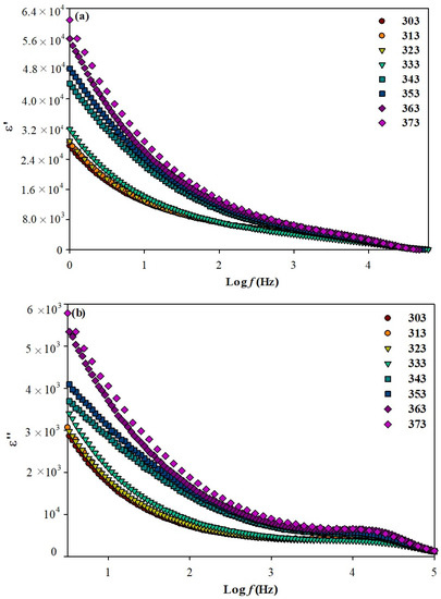 Figure 3a,b represents the plots of and for the highest conducting film with a 60:40 ratio at various temperatures (303 K to 373 K). Based on both figures, it can be seen that the values of and gradually increase with temperature. Presumably, the increase of temperature may increase the free volume and mobility of polymer segments, which facilitates the dipole orientation due to the greater movement of the dipole molecular chain of ILGPE [28,33].