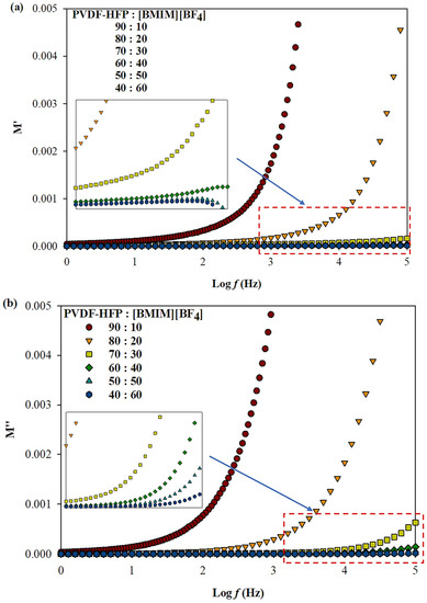 Further interpretation of the impedance data was carried out through dielectric modulus which study the behavior of electrode–electrolyte polarization effect at different frequencies. Figure 4a,b display the dielectric modulus of real () and imaginary modulus part () as a function of frequency for the samples with different percentage ratios of PVDF-HFP to [BMIM][BF4]. The and are calculated based on equation (3) and (4), respectively. As the frequency increases, and also increased due to the distribution of the relaxation process and attain maximum value in the higher frequency range. From both figures, and were observed to have peak dispersion in the high frequency region and decreases towards the low frequency region. The peaks at high frequencies highlighted on the bulk effect revealed that the ILGPE films are predominantly ionic conductors [34]. As the loading of IL increases, the spectra are shifted to the right beyond the frequency range used in this experiment indicating that the ILGPE film are purely an ionic conducting system. On the contrary, and values approaching zero in the low frequency region are associated to the electrode–electrolyte polarization effect. Generally, the polarization effect at electrode–electrolyte interfaces is often suppressed at lower frequency, giving small values (tending zero). This indicates the removal of electrode polarization [35]. The plots that display a long tail close to the x-axis are due to large capacitance value that correlates with the large polarization effect at the electrode–electrolyte interface [27]. Therefore, the loading of 60% [BMIM][BF4] incorporated into the system proves that the films are purely due to ionic conductors.