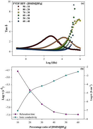 (a) Frequency dependence of tan δ and (b) relation between relaxation time and ionic conductivity for different percentage ratios of PVDF-HFP to [BMIM][BF4].