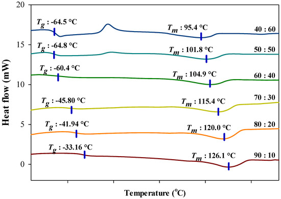 DSC analysis presents the essential information on the thermal characteristics of the electrolyte such as glass transition temperature (), melting temperature () as well as the crystallization temperature (). Figure 7 depicts the heat flow curves in the temperature range of −100 °C to 180 °C for different percentage ratios of ILGPEs and Table 1 provides the thermal properties of reference for PVDF-HFP and [BMIM][BF4] [22,42,43,44,45]. In ensuring the ILGPE films are completely free from any remnant trace of solvent and trapped moisture, all DSC traces were taken during the second heating. Based on the graph shown in Figure 7, it can be seen that upon higher incorporation of [BMIM][BF4], and values for all films shifted to lower temperature region, from −33.16 °C to −73.78 °C and 126.13 °C to 100.67 °C, respectively [46]. Along with that, there is an appearance of exothermic crystallization peak at higher percentage ratio, notably at 50:50 and 40:60 PVDF-HFP to [BMIM][BF4] which has also shifted to lower temperature; −3.39 °C and −6.54 °C. The shifting indicates that there is an interaction occurred between the polymer matrix, PVDF-HFP and ionic liquid [BMIM][BF4]. From the results, it shows that with further incorporation of [BMIM][BF4], of ILGPE films have decreased and inclined towards the of pure [BMIM][BF4]; −84 °C. This expresses the dominant influence of [BMIM][BF4] in the polymer matrix and that the plasticizing effect of the IL have weaken the intermolecular interactions between the polymer chains [47]. The weakening of the forces increases the flexibility of the polymer backbone and therefore, give rise to the ionic conductivity of the ILGPE [48,49]. Meanwhile, the shifting of to a lower temperature region suggests that there are more amorphous phases present in the ILGPE system. Pandey et al. [50] reported that a broader peak is attributed to the presence of liquid components that cause an increase in the amorphous proportion in the overall material.