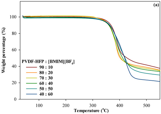 The DTG peak in Figure 8b shows a sharp peak of degradation temperature () for each film. Incorporation of 10% to 30% [BMIM][BF4] showed only one peak at ranging from 370 °C to 390 °C which was due to the degradation of [BMIM][BF4] as mentioned before. At higher incorporation of [BMIM][BF4] of 50% and 60%, there is another peak with at 419 °C. This peak corresponds to the degradation of PVDF-HFP [51]. From the results, the decrease in thermal stability proves that polymer matrix and IL incorporated well with each other and was still in the right temperature working range that is suitable for most applications in electrochemical devices, in particular at high temperature.