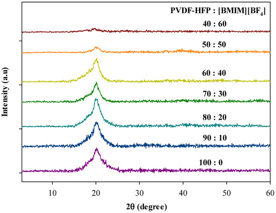 Diffractogram of pure PVDF-HFP and different percentage ratio of PVDF-HFP to [BMIM][BF4].