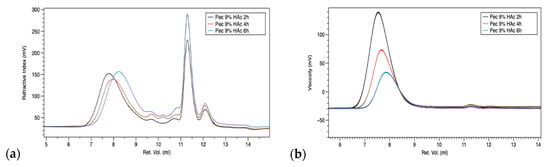 Data reported in Table 3 highlight a clear decrease in Mw, Mn, and IV with the increasing extraction time with an acetic acid concentration of 9%, indicating that pH and extraction time play an important role in pectin structure and its final properties; however, pectin extracted with 3% HAc for 6 h shows higher values of all parameters. By observing chromatograms at a refractive index (RI) detector of 9% HAc series (Figure 1a), it is possible to note that the increase in extraction time (2–6 h) leads to degradation of higher molecular weights (differences in the starting point of the curves in the 6.7–9.5 mL region) and an increase in the area in the 9.5–12 mL region, corresponding to the lower molecular weights-oligomeric fraction, together with other fractions present in citrus waste, such as polyphenol, flavonoids, and others. This behavior is also supported by chromatograms analyzed through a viscometer detector (Figure 1b), in which the decrease in viscosity emphasizes the degradation trend.