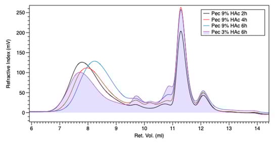 Comparing this trend with PEC-6h-3% (in Figure 2 it was indicated as PEC 3%-HAc-6 h), it is possible to observe that the polymeric peak is detected at a higher retention volume (higher molecular weights) for the PEC-2h-9% (in Figure 1 and Figure 2 it was indicated as PEC 9%-HAc-2 h) sample. Comparing the area of the PEC-6h-3% chromatogram in the 9.4–12 retention volume range with the corresponding area of PEC-2h-9%, we can note that in the last chromatogram, there is a big increase in a low molecular weight fraction, which accounts for the best mechanical performance of the pectin extracted with low HAc content. In fact, this low molecular weight fraction acts as a plasticizer in appropriate quantities to achieve the best mechanical properties.