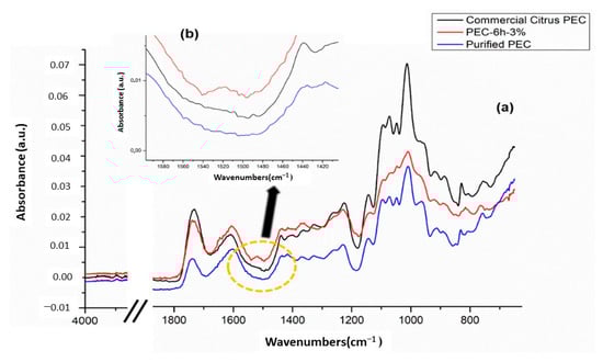 In Figure 3a, we present the FTIR spectra of pectin recovered after 6 h—3% (v/v) of HAc, purified pectin, and a FTIR spectrum of commercial citrus pectin. In general, for all pectins, it is possible to observe that the strong and wide peak at 3364 cm−1 was attributed to the O–H elongation vibrations, and the 2936 cm−1 peak could be induced by the C–H elongation vibrations of the CH2 and CH3 groups in the pectin. The absorption peaks shown at 1731 cm−1 and 1608 cm−1 were assigned to the C=O stretch vibration of the methyl esterified carboxyl and to the asymmetric stretch vibration C=O of the free carboxyl, respectively. The absorption bands at 1143 cm−1 and 1048 cm−1 corresponded to the stretching vibrations of the lateral groups C–OH and to the vibration of the glyosidic bond C–O–C [46]. Figure 3a shows the FTIR-ATR spectra of the PEC-6h-3%. In the region 3400–2500 cm−1, a wide absorption band is observed because of the stretching vibrations caused by intermolecular interactions through the O–H bonds between the pectin monomers. The peak at around 2950 cm−1 refers to the C–H vibrations of the methynic groups in the polymer chain and the methyl group of the methyl ester. These include the bending and stretching vibrations of CH, CH2, and CH3 [47]. The peaks at 1760–1730 and 1630–1600 cm−1 were due to the relative contribution of the ester carbonyl groups (C=O) and to the stretching of the carboxylate ions (COO−), respectively [48]. The carboxylate groups show a weaker symmetrical stretch band near 1400 cm−1. In the pectin samples, the weakest COO− symmetric stretch is followed by moderately intense absorptions between 1300 and 800 cm−1, collectively defined as the region of the fingerprint that is unique for a compound. These bands are generally difficult to interpret. Other minor bands in pectin samples are C–H bending and C–O stretching occurring at 1380 cm−1 and 1300–1000 cm−1, respectively [49]. The absorption peaks at 1100–1040 cm−1 were assigned to the C–O–C stretch vibrations of the polymer chain structure [50]. In particular, it is possibly evidenced that in the spectrum of PEC-6h-3%, a sharp absorption band is also observed between 1600 and 1500 cm−1 due to aromatic double bonds (aromatic rings) related to the presence of bioactive molecules (circled by the yellow circle), as indicated by the black arrow in Figure 3b. Moreover, at around 1520 cm−1, there is a new peak, indicating the functional group of the phenolic compound in the PEC-6h-3% sample [51]. This confirms that simply washing the liquid extract with alcohols does not completely remove the polyphenols fraction. Moreover, the spectrum of purified pectin obtained is perfectly comparable with commercial citrus pectin. Thus, the purification treatment recovers a pectin that is very similar to commercial pectin, as shown from Figure 3a.