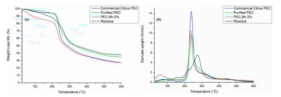 In DTG curves of commercial citrus PEC and purified PEC, one can note the presence of the peak related to bioactive molecules and the lignocellulose fraction. This confirms that the purification treatment of extracted pectin is necessary in order to obtain a pectin with a similar structure to that of commercial citrus pectin. In Figure 4b, the DTG curve of the pectin residue is shown. Moreover, in this case, a mass variation was observed in the DTG curve of the residue, evidenced by a very small and wide peak at a temperature of around 100 °C, corresponding to the loss of water. In addition, two flex points were observed in the DTG curves. A first peak, more crowded and less clear, occurred at around 250 °C due to the thermal degradation of the hemicellulose fraction in the residues [58].
