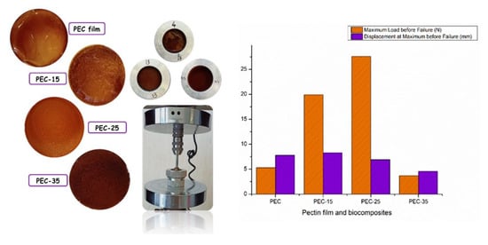 The value of the force to breaking of the biofilms increases from PEC to PEC-25, as can be seen from Figure 5. For the PEC-35 biocomposite, it is possible to observe a decrease in the value of the force to breaking. Evidently, the presence of filler in an elevated amount induced a poor interfacial adhesion between the liquid matrix and the residue, which is also jointly responsible for the scarce mechanical stress transfer from the continuous to the dispersed phase.