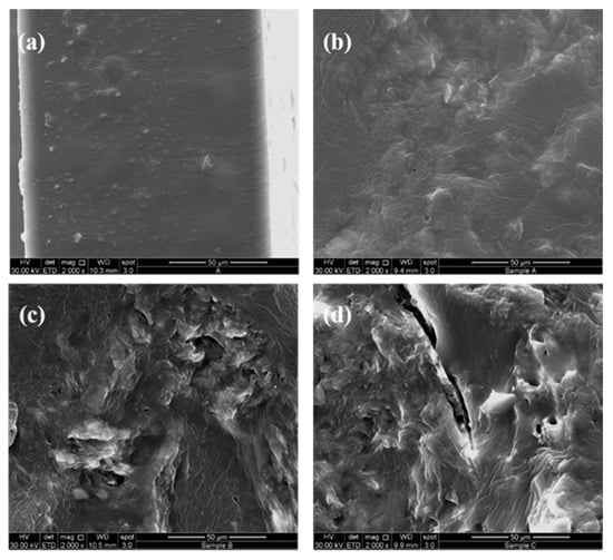 For this reason, from Figure 7c,d, it is possible to note the presence of rough and smoothed zones typical of a material with poor interfacial adhesion between the polymeric matrix and filler.