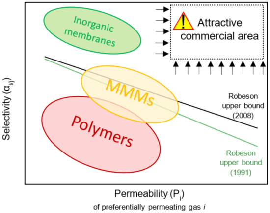 Relationship between permeability and selectivity. Current situation between different membrane composition regarding Robeson upper bound and the attractive commercial area. Adapted from Dechnik et al. [26].
