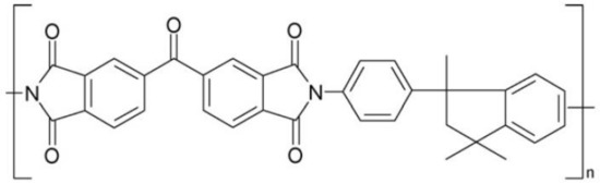 Despite the availability of different research studies dealing with hydrogen recovery by commercial membranes already used for gas separation, such as PRISM® (polysulfone), MEDAL® (polyimide, polyamide), SEPAREX® (cellulose acetate) or UBE® (polyimide), which lead to H2/CO2 selectivity up to 3.8, currently, effort is focused on the search for materials that are more selective towards hydrogen [13,23]. PMDA-based (pyromellitic dianhydride), 6FDA-based (4,4′-(hexafluoroisopropylidene) diphthalic anhydride) polyimide membranes and Matrimid® (5(6)-amino-1-(4′ aminophenyl)-1,3,-trimethylindane) constitute some of the polymers that are the most widely studied [27]. Among these polymers, Matrimid® stands out due to its commercial availability, good chemical resistance and thermal properties (Tg ≈ 305–315 °C), high solubility in several solvents (e.g., dichloromethane-DCM-, tetrahydrofuran-THF- and N-methylpyrrolidone-NMP-) and good processability, and it exhibits a good tradeoff between H2 permeability and both H2/N2 and H2/CO2 selectivities, fulfilling the main features that should characterized membranes for ideal gas separation [28,29,30]. Matrimid® 5218, whose chemical structure is represented in Figure 2, is obtained by the polycondensation of 3,3′,4,4′-benzophenone tetracarboxylic dianhydride (BTDA) and a mixture of two cycloaliphatic monomers, such as 5,6-amino-1-(40-aminophenyl) and 1,3,3-trimethylindane [31,32]. As glassy polymer, Matrimid®, and polyimides in general, is characterized by an excess of free volumes that contribute to the gas transport properties, conferring acceptable values of selectivity and permeability [25,28].