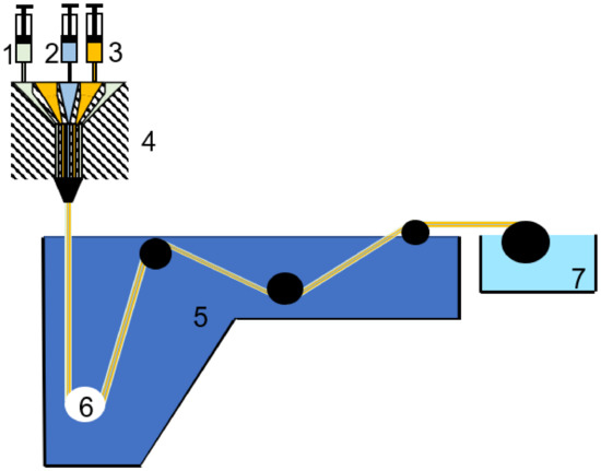 Dual-layer hollow fiber spinning by dry-jet/wet-quench set-up: (1) outer dope fluid, syringe pump and outer channel; (2) bore fluid, syringe pump and bore channel; (3) inner dope fluid, syringe pump and inner channel; (4) dual-layer spinneret; (5) coagulation bath; (6) fiber guiding wheel; (7) fiber collecting wheel.