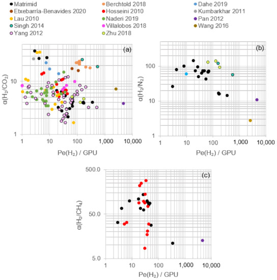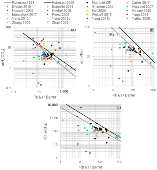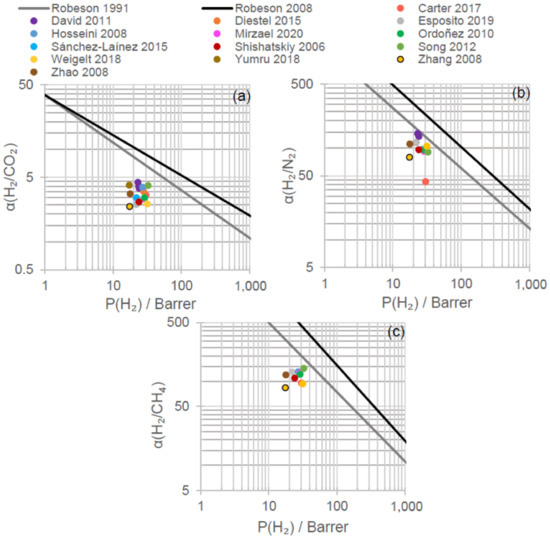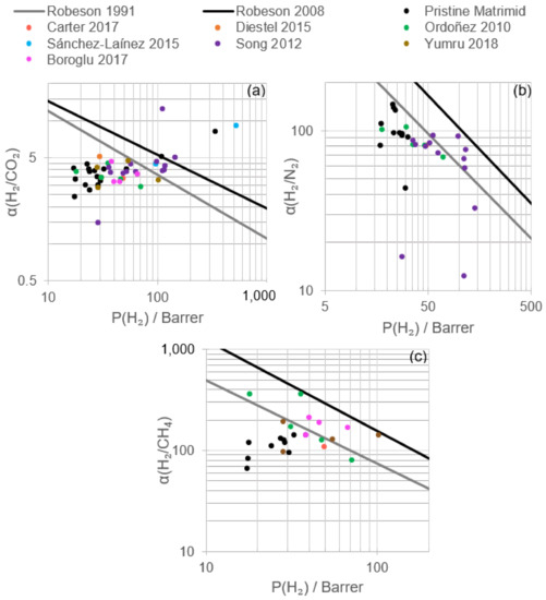 Robeson plot for (a) H2/CO2, (b) H2/N2 and (c) H2/CH4 single gas permeation tests through pristine Matrimid® membranes. Reference correspondence is found at Table 2.