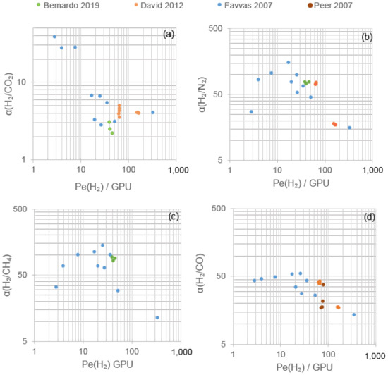 In addition to N2 and CO2, although to a lower degree of significance, the permeability of other waste gas components, such as CH4 and CO, has been evaluated in several works. CH4 and CO are characterized by kinetic diameters of 3.80 and 3.76 Å, respectively, and boiling temperatures of 111.7 and 81.7 K [66,67]. In CH4 single gas permeation tests, permeabilities in the range of 0.21–0.32 Barrer were obtained, with a corresponding H2/CH4 selectivity of 66.5–142.7 (Figure 4) [42,43,44,45,50,62]. Meanwhile, in a CO single-gas permeation test, permeability reached 0.33 Barrer and H2/CO2 selectivity 54.8 [47]. The permeabilities obtained for CH4 and CO are consistent with those corresponding to N2 and CO2, due to the higher kinetic diameter of CH4 and CO, which hinders diffusion selectivity, and the relatively low boiling points compared to CO2 that do not favor solubility selectivity.