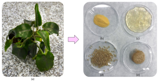 Photographs of (a) Kalanchoe pinnata plant used for extracts preparation (b) native chitosan (CS) (c) crosslinked hydrogel; (d) ready hemostatic agent in the form of beads; (e) hemostatic agent in the form of a patch.