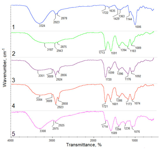 FTIR spectra of the raw fungal chitosan (1), Gel-1 (2), Gel-2 (3), Gel-3 (4), and Gel-4 (5) samples containing plant extract prepared using commercial Kalanchoe pinnata extract.