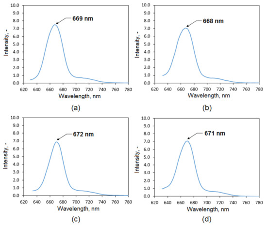 Figure 5 shows fluorescence spectra of the evaluated extracts. One may observe that all four samples exhibit similar peaks with the maximum at 669 nm (commercial extract), 668 nm (plant extract 50% EtOH), 672 nm (plant extract 95% EtOH), and 671 nm (plant extract 95% EtOH/ultrasounds), respectively. The signals come from porphyrin dyes present in the Kalanchoe pinnata Chlorophyll a. Their intensity is similar, which suggests comparable content.